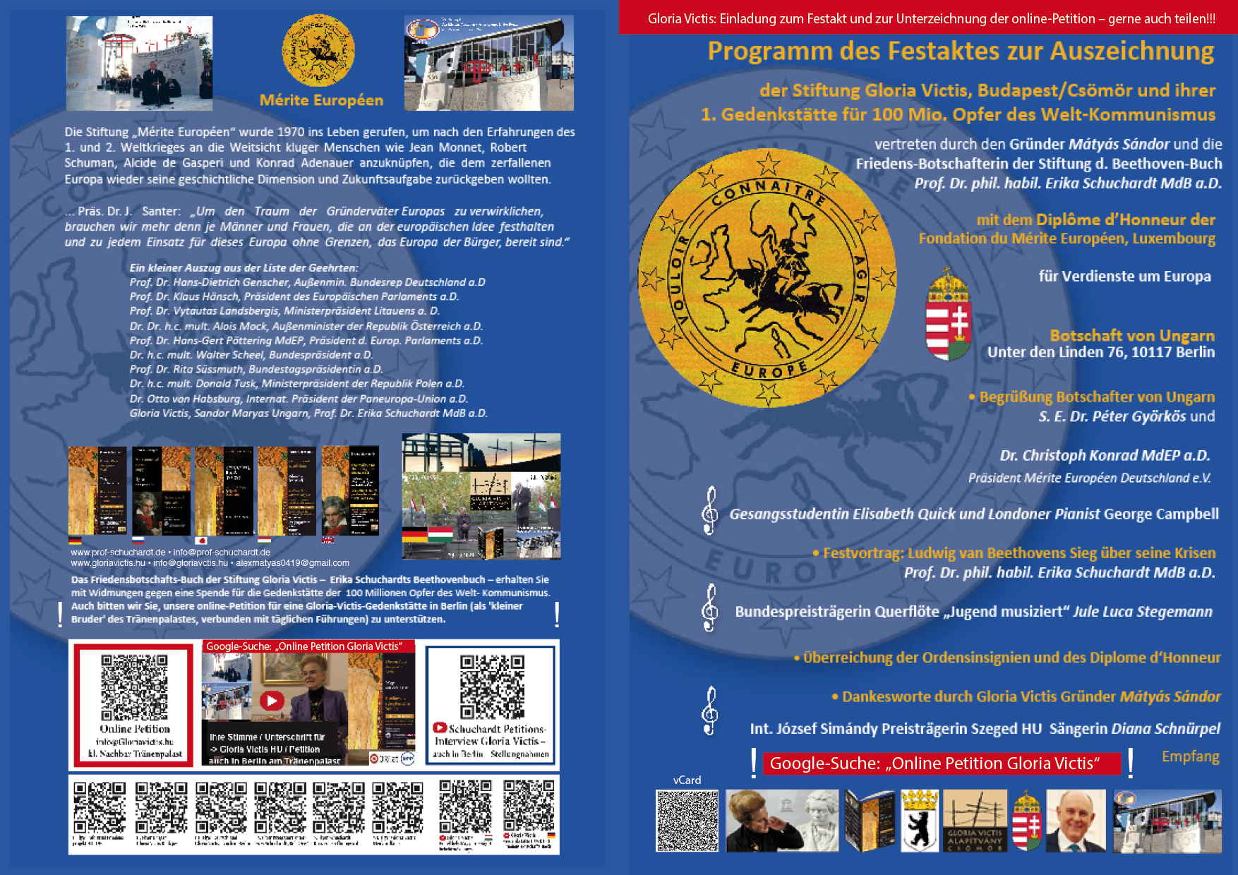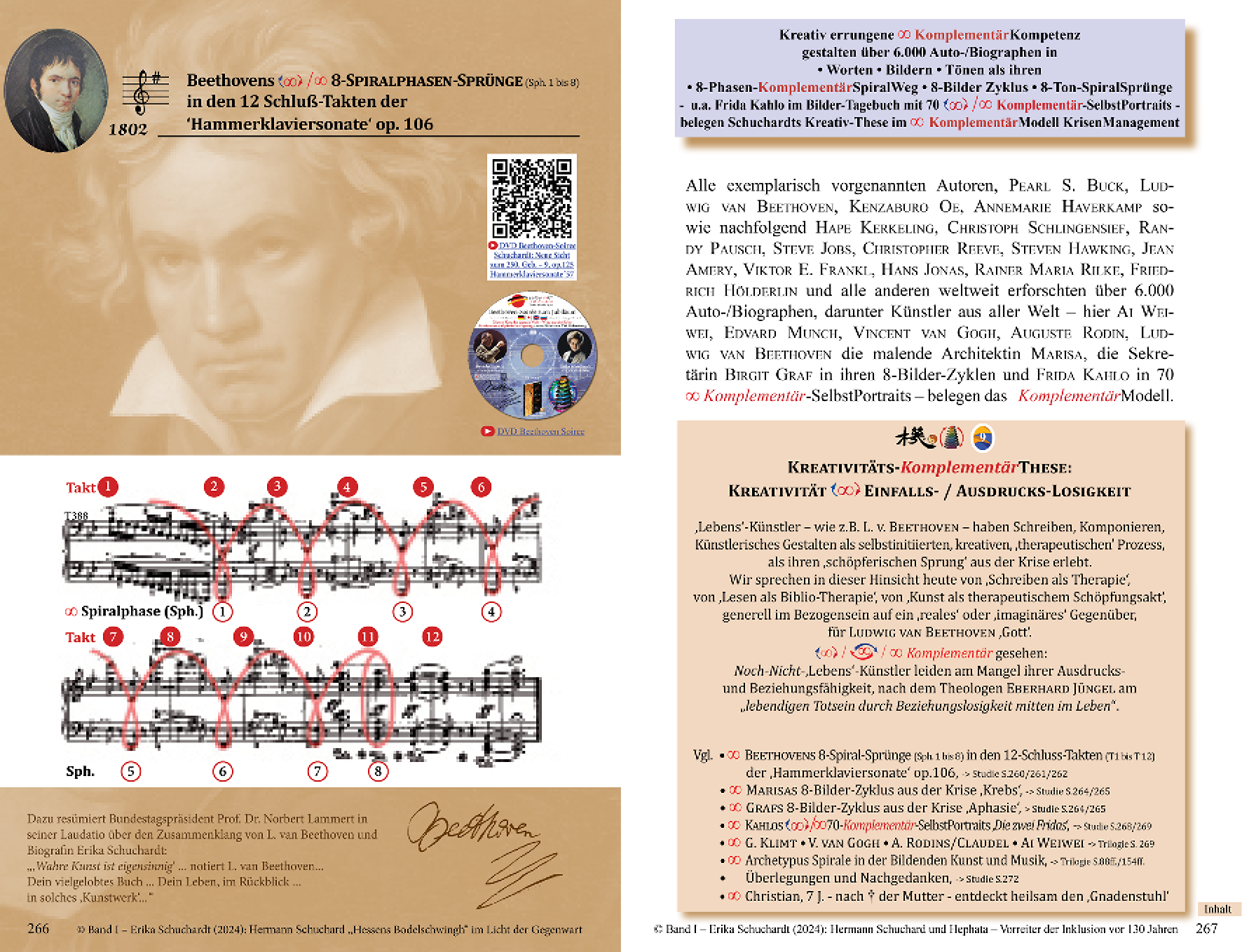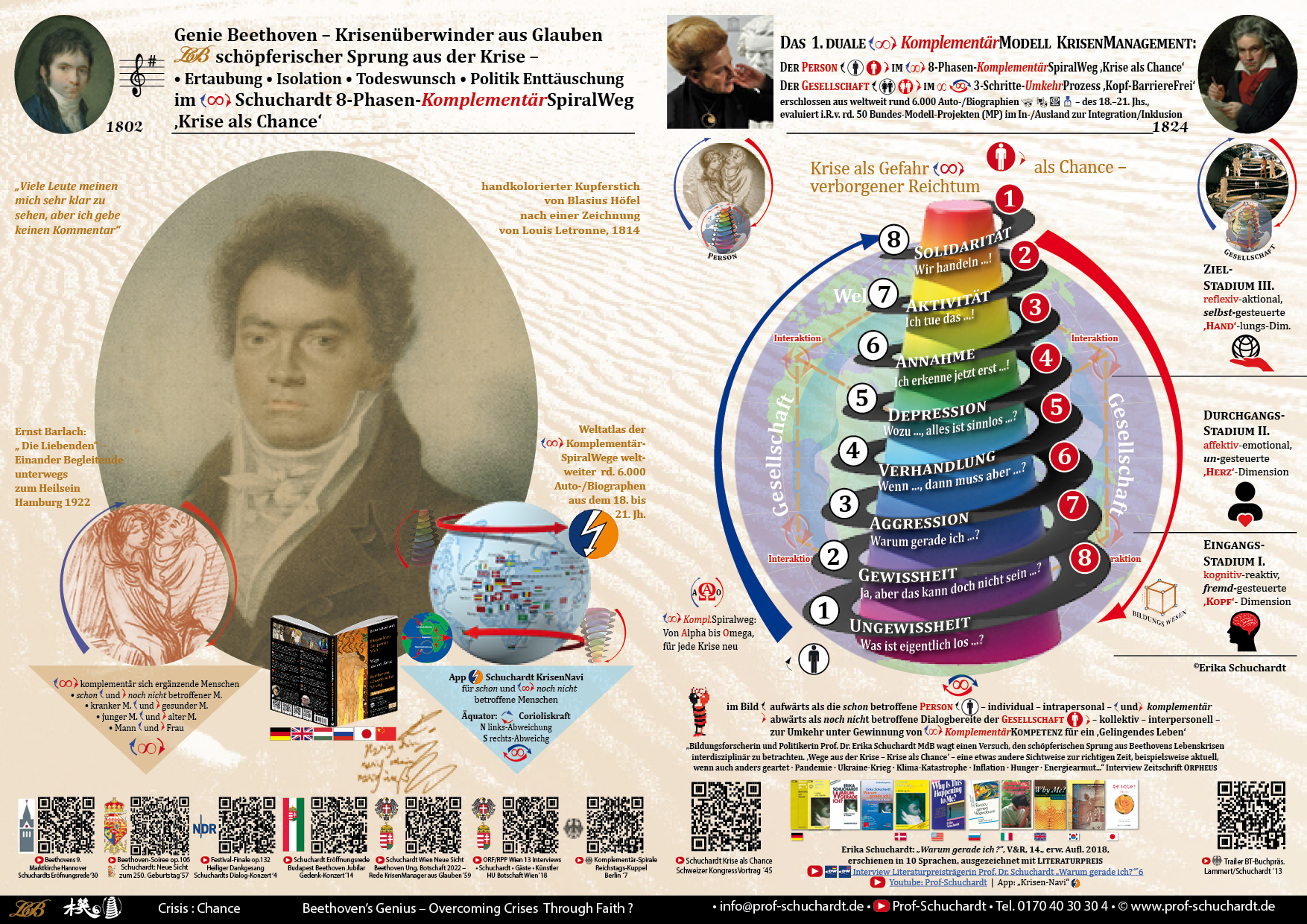 Beispiel Beethovens LebensKomplementärSpiralWeg der Krisenverarbeitung, der sich, prototypisch nach dem SKmKm, von Ertaubung, Isolierung, Todessehnsucht und Politikenttäuschung befreit hat und als frühes „role model“ eines KrisenManagers gilt, wie die Autorin Erika Schuchardt in ihrer 2023 von der ungarischen Stiftung Gloria Victis zum Friedensbotschafts Beethoven-Buch gekürten Studie Diesen Kuss der ganzen Welt – Wege aus der Krise. Beethovens schöpferischer Sprung aufgezeigt hat, für die sie im selben Jahr gemeinsam mit dem StiftungsGründer Mátyás Sándor, mit dem sie aktuell für die Errichtung einer Berliner Gedenkstätte für die 100 Mio. Opfer des Weltkommunismus kämpft, den Preis der Stiftung Mérite Européen erhalten hat. (s. nachfolgend 6 Flyer, Petition und Stellungnahmen zu „Gloria Victis“)